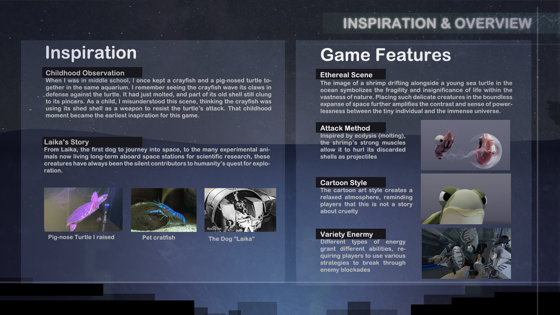 A bullet-hell adventure set aboard a spaceship, where players control a small shrimp navigating through waves of enemies to reach the escape pod and surviving as long as possible in the depths of space