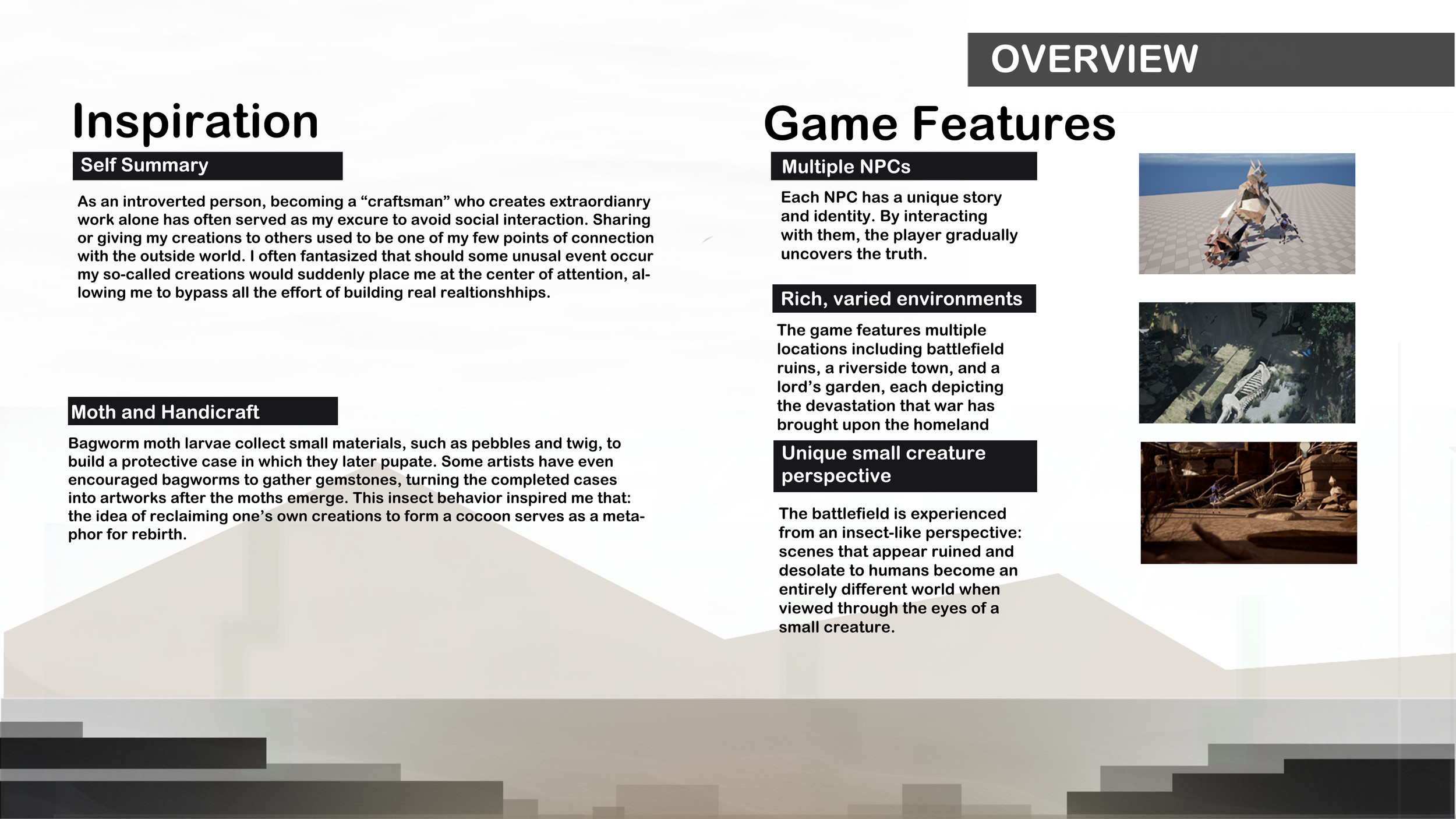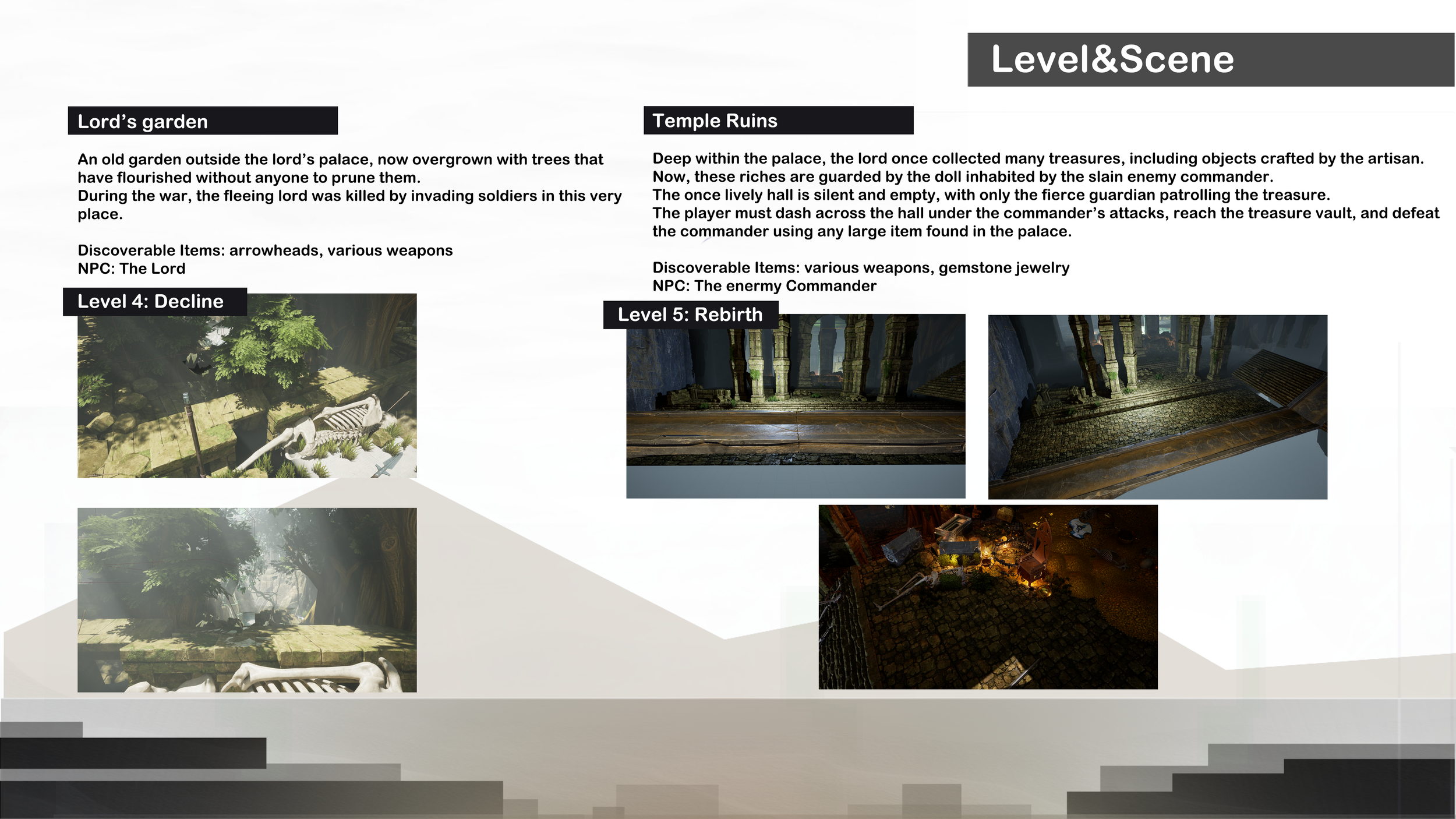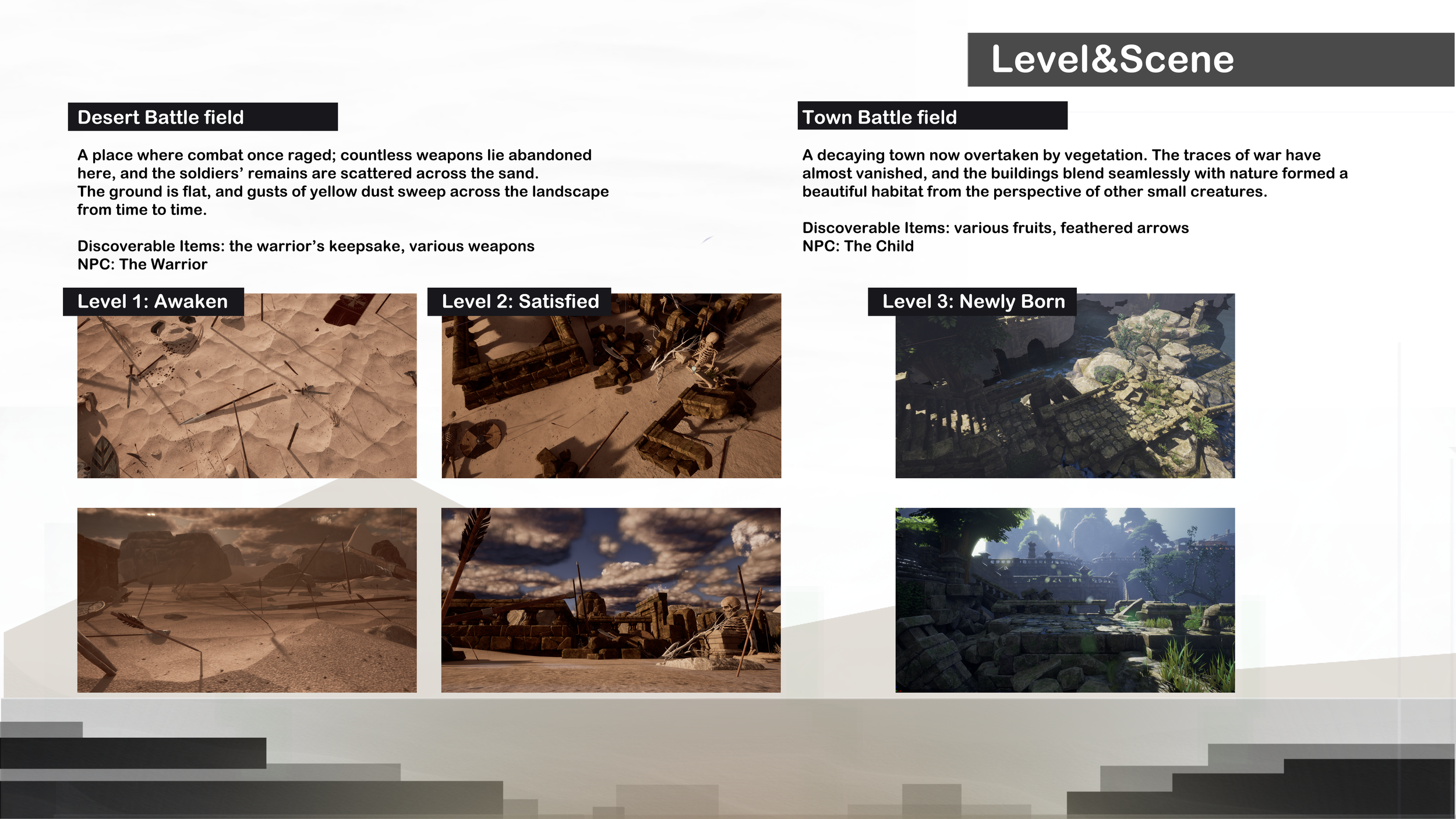 A narrative exploration game set in and around a war ravaged town. The soul of a craftsman lingers within the artifacts he once created. To regain his human form, he must reclaim these objects from those who now possess them. The game go though seven levels, the players needs collect all the necessary props by searching and exchanging with NPC to pass 1-6 level then break through the Blockade of the Boss to complete the game.